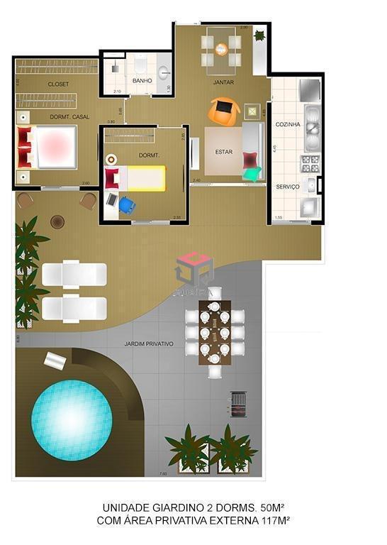 Apartamento com 117m² de área privativa total, sendo 50m2 internos e mais o terraço/ jardim privativo, num diferenciado condomínio praça Club.