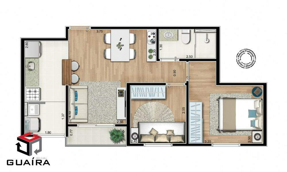São 3 opções de plantas, de 37 a 50m². Sendo elas, de 1 a 2 dormitórios (1 sendo suíte), uma varanda na sala, cozinha que pode ser integrada e de 1 a 2 banheiros ao total.