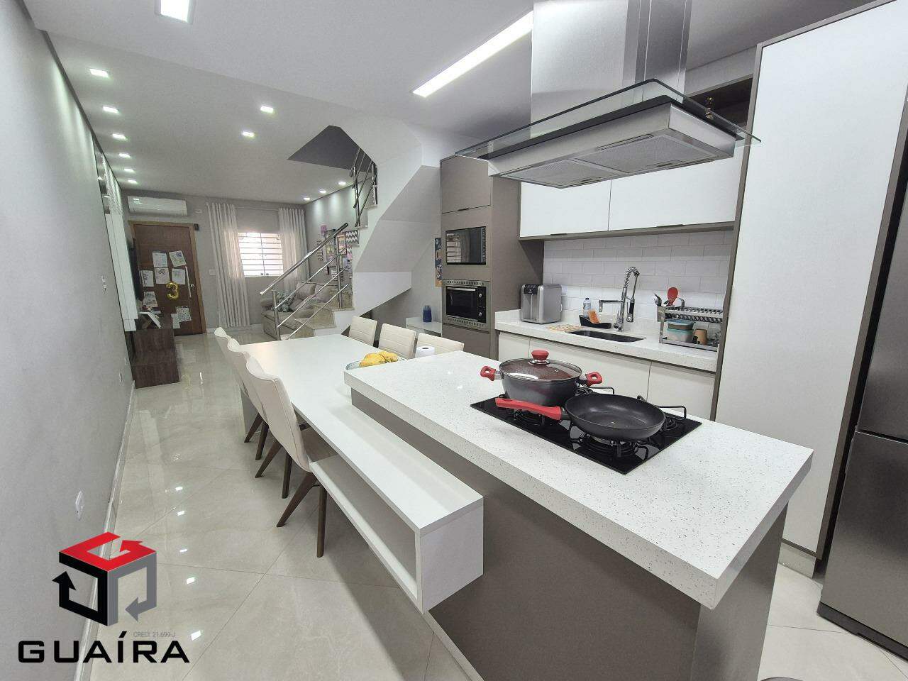 Sobrado novo e moderno, em excelente localização, no bairro Bangú, encostado no Parque das Nações, pertinho da Rua Oratório e da Av. Itamarati, próximo também da Universidade Federal do ABC (UFABC), com fácil acesso para o centro da cidade e Av. dos Estados, e com uma completa estrutura de comércios e serviços na região. O sobrado conta com 116m² de área privativa, e está todo planejado. São 2 suítes, sendo a suíte principal com closet, mas é possível reverter para o terceiro quarto. Sala ampla com ar condicionado, integrada à cozinha que é super moderna, está repleta de armários, e tem uma bela ilha para as refeições em família, e ainda lavabo e um pequeno espaço e quintal que está com cobertura de vidro. No último andar tem espaço de lavanderia com uma pequena área externa, lavabo, e uma área gourmet incrível, toda planejada, também com uma área externa por onde entra muito sol. É o espaço perfeito para confraternizações com a família e os amigos. Tem espaço para 2 carros na garagem e portão automático. Agende sua visita e vem conhecer seu novo endereço. Somente venda, aceita financiamento. Guaíra Imóveis – Desde 1987, conectando pessoas aos seus sonhos com solidez, transparência e um atendimento digitalmente humanizado. Com agências no ABC e em São Paulo e uma equipe com mais de 250 corretores prontos para te ajudar a comprar, vender ou alugar seu imóvel com segurança e agilidade. Todos os preços e condições comerciais estão sujeitos a alterações – Creci 21.699-J.
