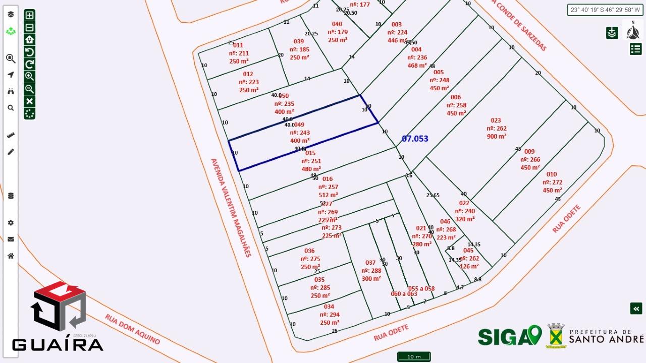 Terreno com 400m² Boa Opção para incorporadores. Plano em rua de aclive, Medidas: 10x46x10x48m = Reg. Fiscal PMSA Boa Localização perto de comércios e serviços, possui serviço de transporte em frente. fica a 5 minutos de carro, do Shopping Atrium , Poupatempo Santo André e Estação Saúde da Prefeitura de Santo André. Servido por transporte coletivo em frente, interligando estação da CPTM e Linha de Corredor Urbano Jabaquara - ABC - São Mateus ZL. Atualmente com 4 casas para renda de aluguel, com inquilinos ativo. Guaíra Imóveis – Desde 1987, conectando pessoas aos seus sonhos com solidez, transparência e um atendimento digitalmente humanizado. Com agências no ABC e em São Paulo e uma equipe com mais de 250 corretores prontos para te ajudar a comprar, vender ou alugar seu imóvel com segurança e agilidade. Todos os preços e condições comerciais estão sujeitos a alterações – Creci 21.699-J.